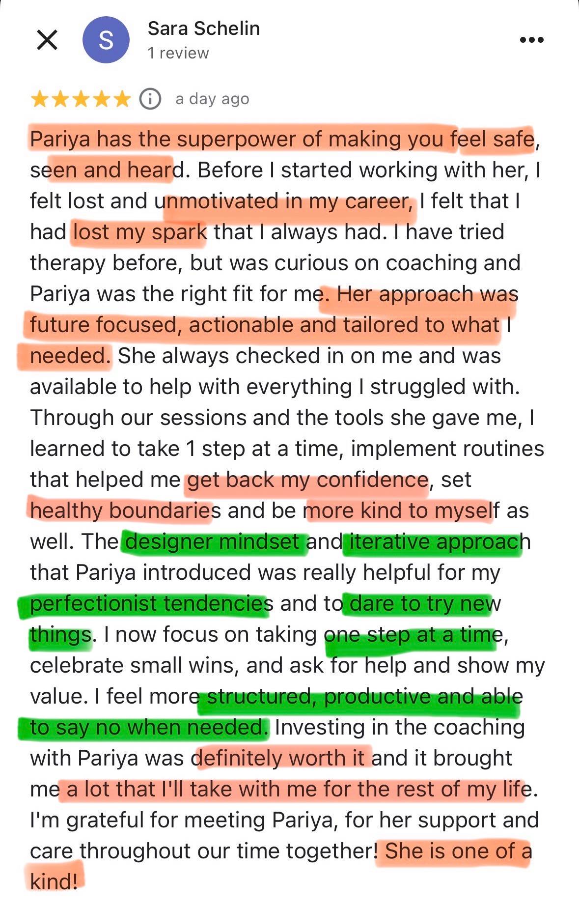 Listen to what Sara told me where we were celebrating the end of our work together: